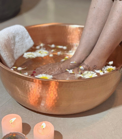 Copper and wood foot bucket & bow and washing cup