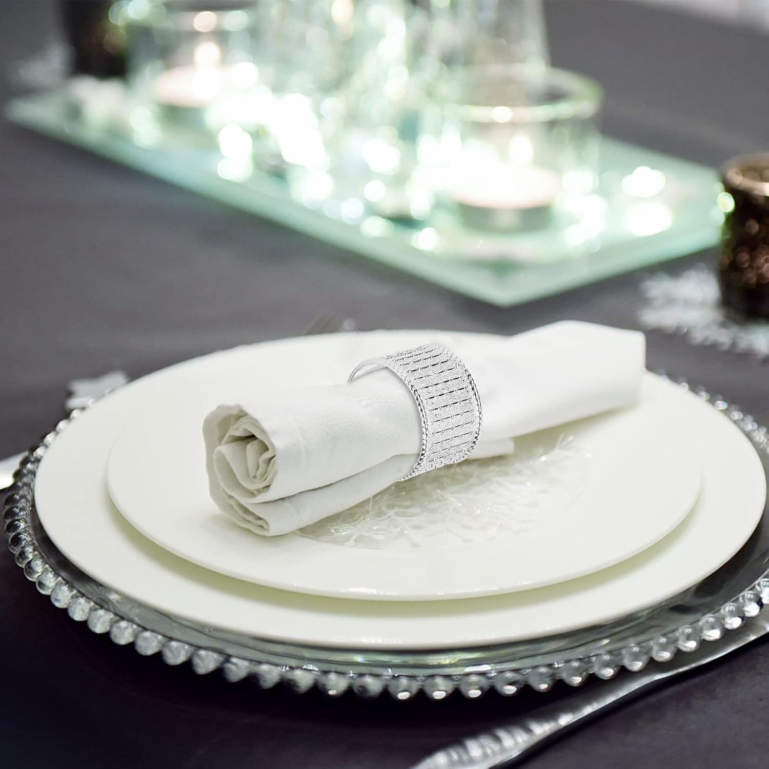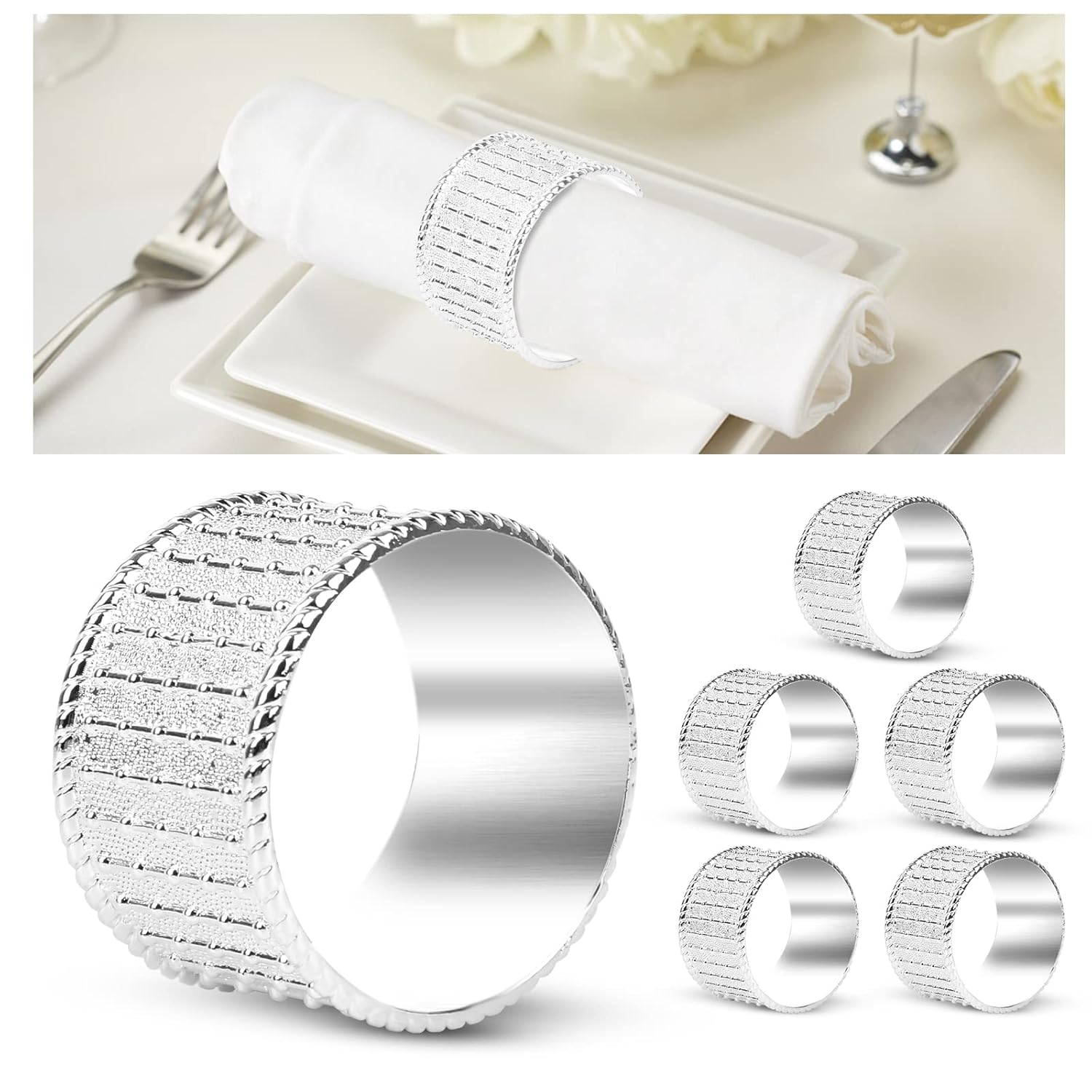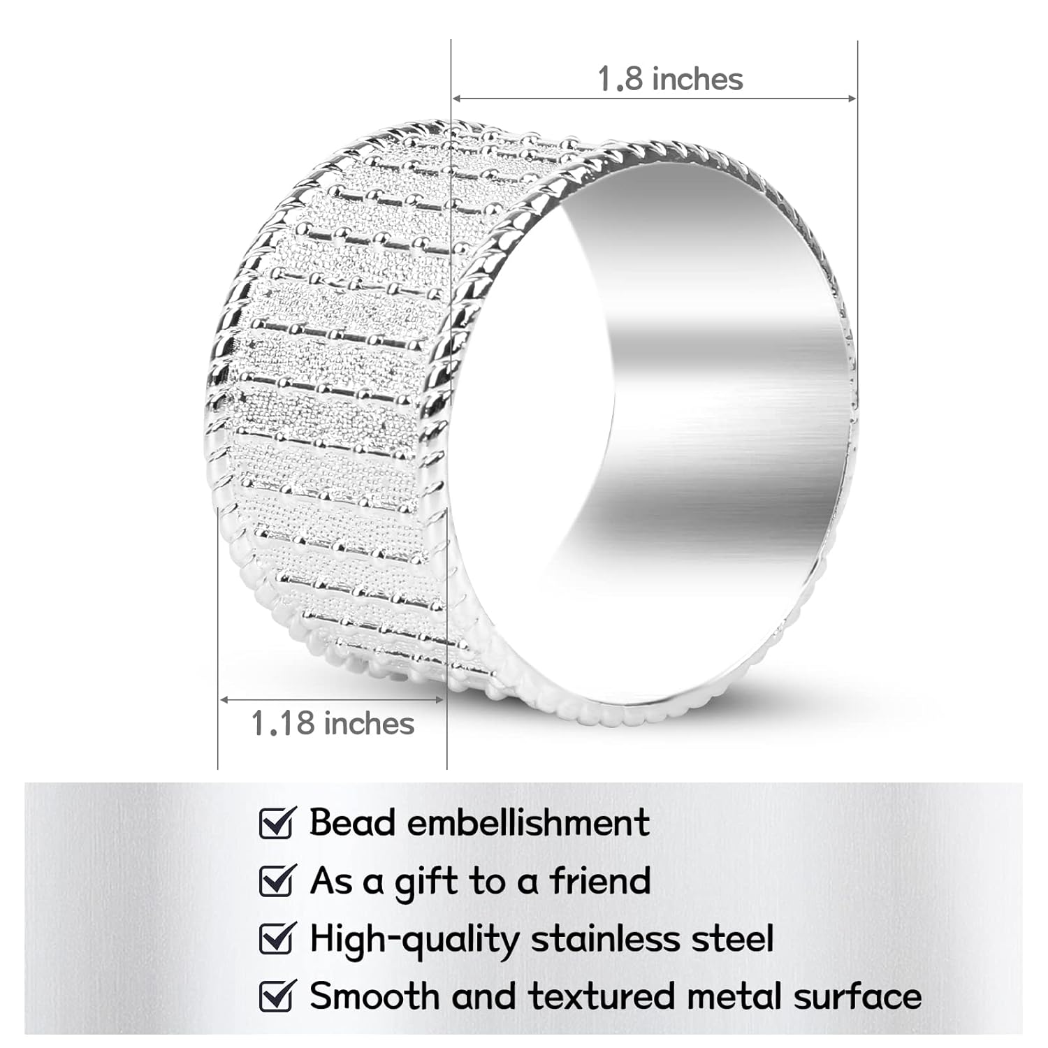 • Material:Stainless steel. Round metal ring, napkins rings silver set with beaded surface decorated, very sturdy and elegant.