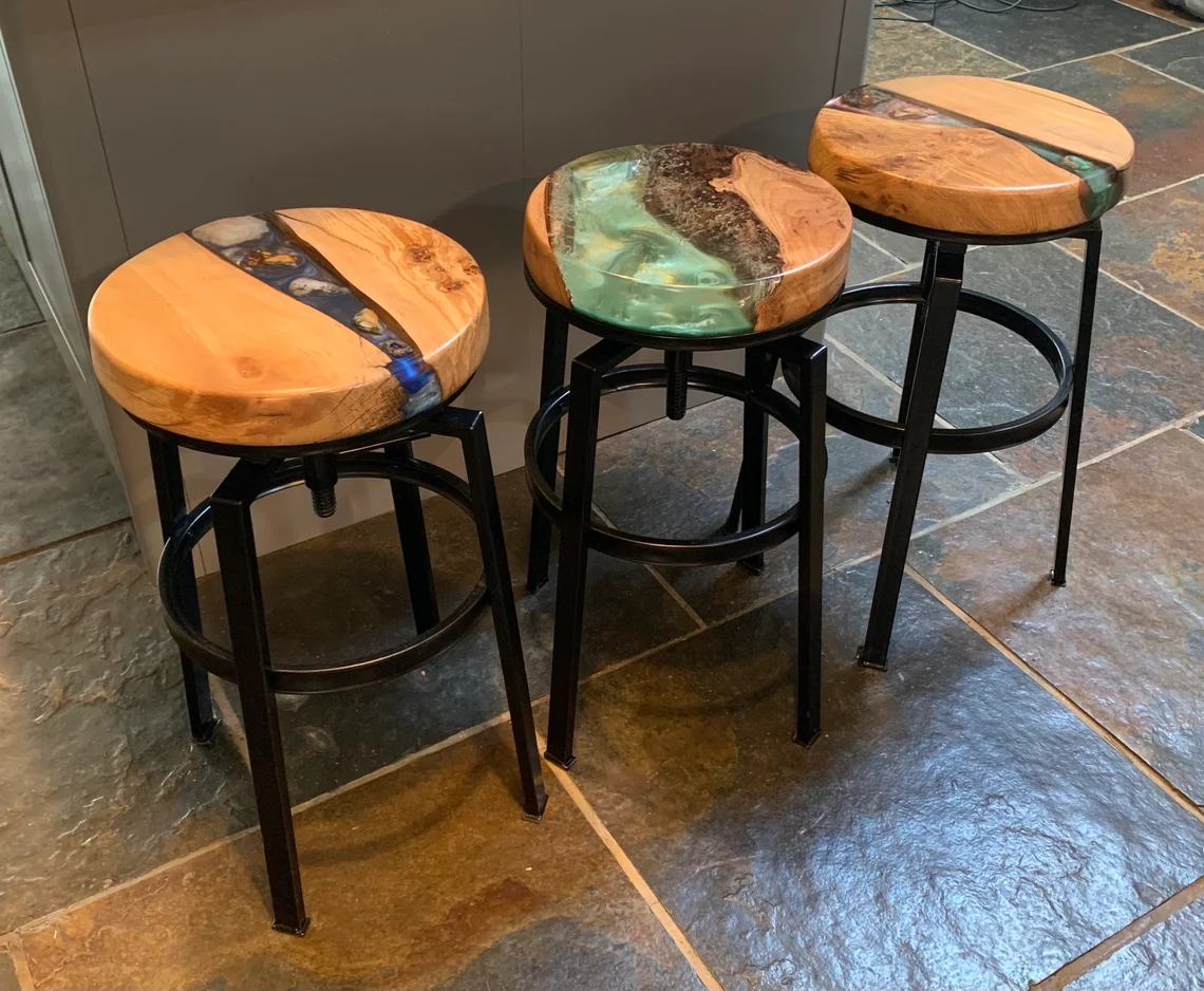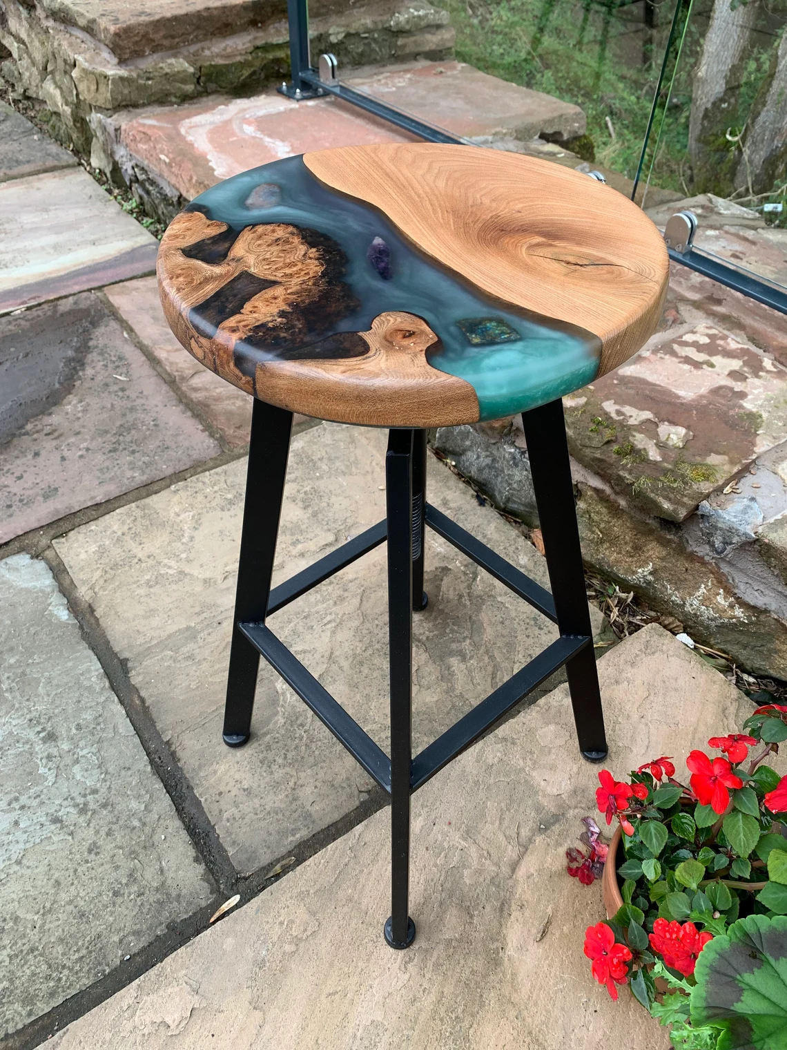 Handmade bespoke stool made from English Elm, with a modern design twist using cast resin.