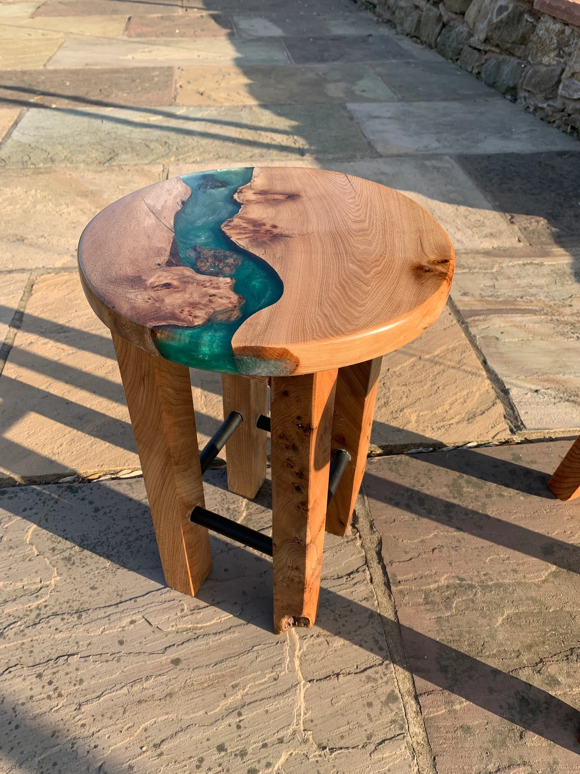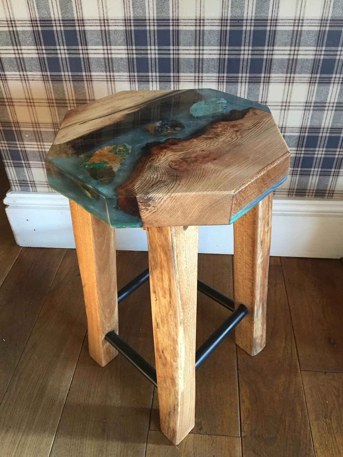 A rustic looking stool made from elm, resin, mineral specimens and steel bar. The top is cut in an octagonal shape.