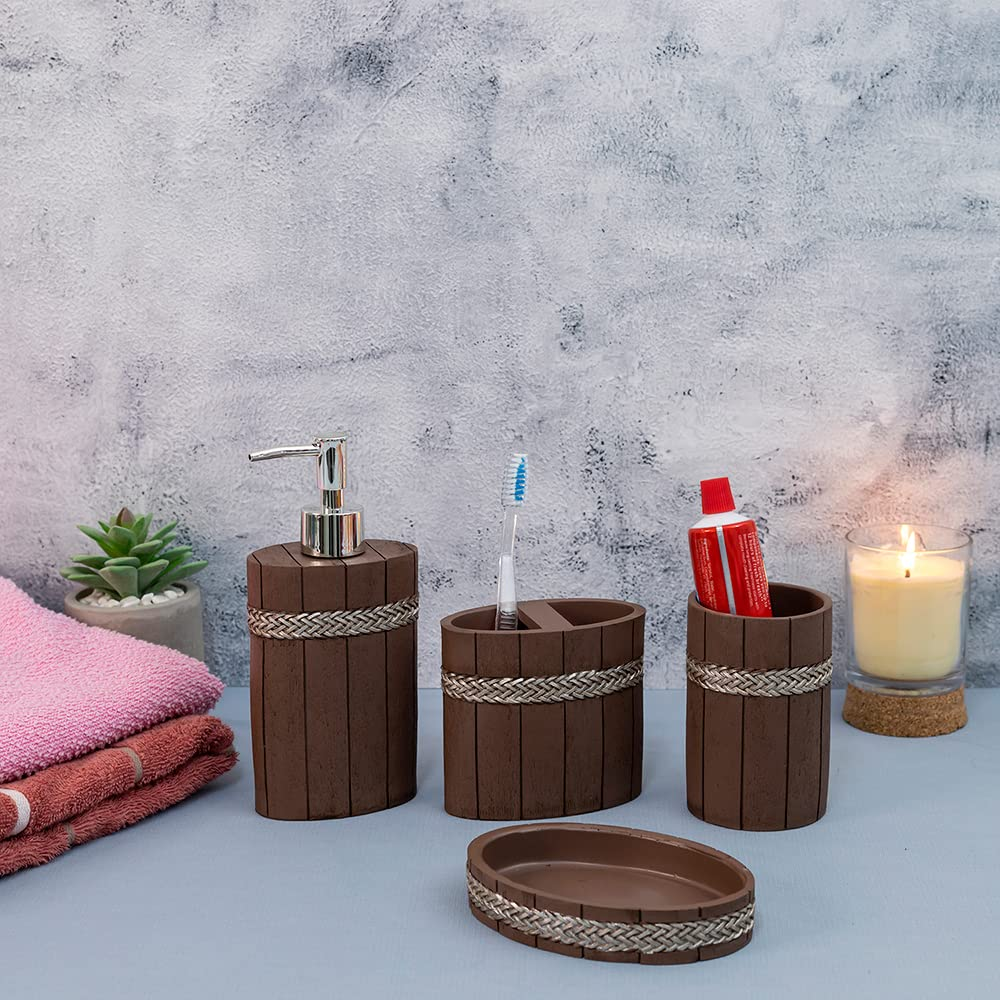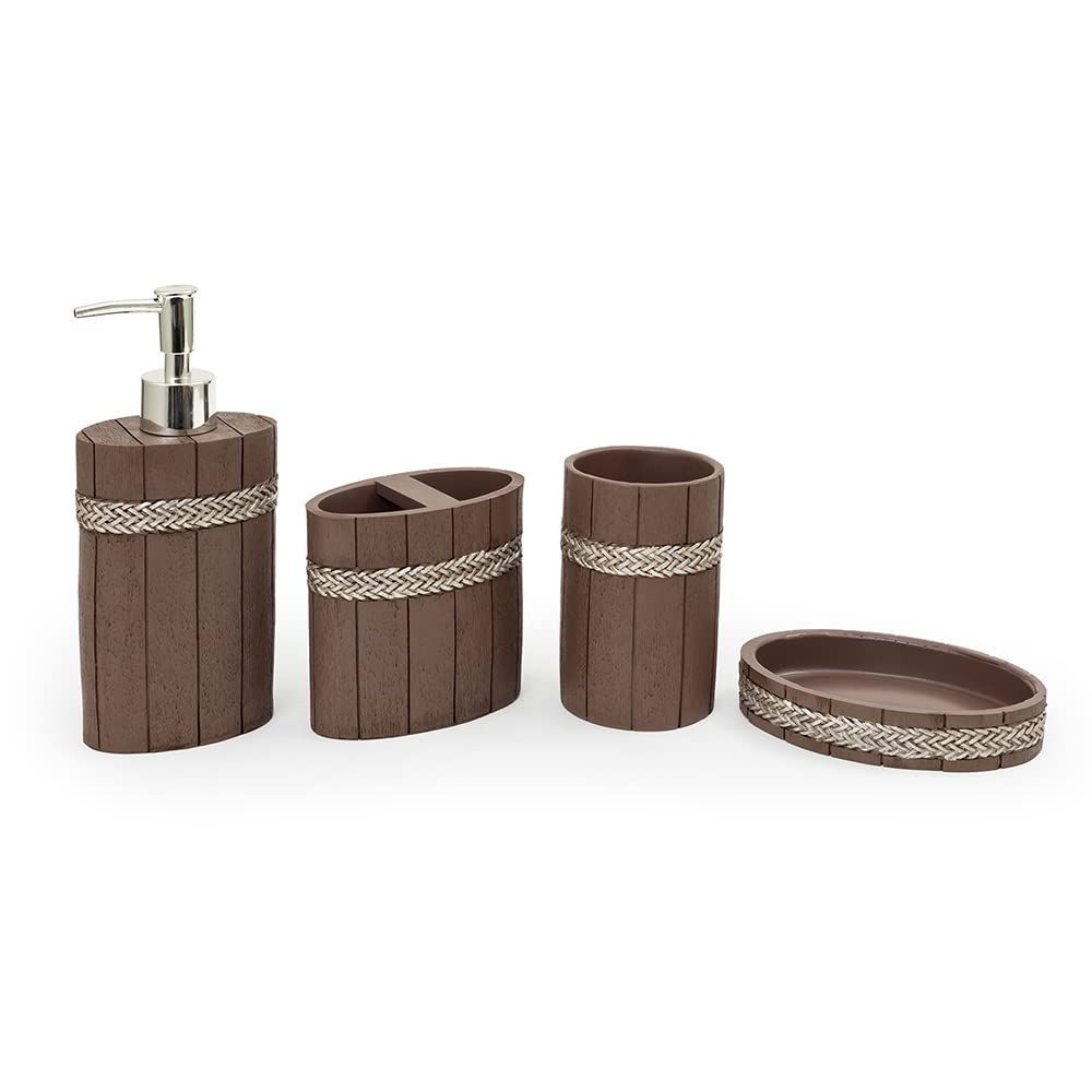 Change your bathroom look with a sustainable addition to it, using EZ Life’s classic looking Resin woodenware 4 piece bathroom set. It’s made with 100% natural, dark wood with jute band design on the outside. This beautiful set comprises of 1 Soap Dispenser, 1 Tumbler Glass, 1 Toothbrush Holder, 1 Soap Tray. This set is highly durable, environment friendly and gorgeous looking set is a perfect gift to anyone who enjoys a touch of nature in their bathroom. It makes an ideal housewarming gift too. Suitability: Perfectly sized and beautifully styled, these sets will be great for any bathroom – be it a large full-sized grand design right down to an en-suite or wetroom. Not limited to home use, the durability of the sets makes them suitable for hotels, resorts or in the chalet. Our Bathroom accessory sets are crafted out of high-quality, which is rust free, resistant, and durable. Its unique design features a surprising lightweight structure and versatility while adding extreme endurance and elegance in the bathroom. The Bathroom adopted is more beautiful, generous, and durable than similar products. Great Gift Idea: The bathroom set accessories were well-packed to ensure that they arrived safely without damage. Perfect gift for your families, friends, lover, colleagues, housewarming or a wedding. MULTIPURPOSE – Perfect accessory for your bathroom