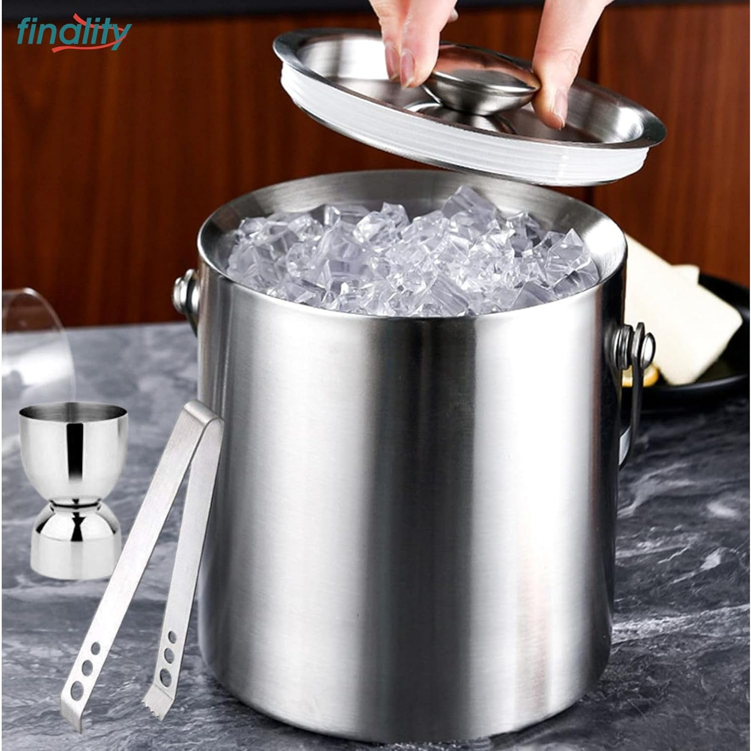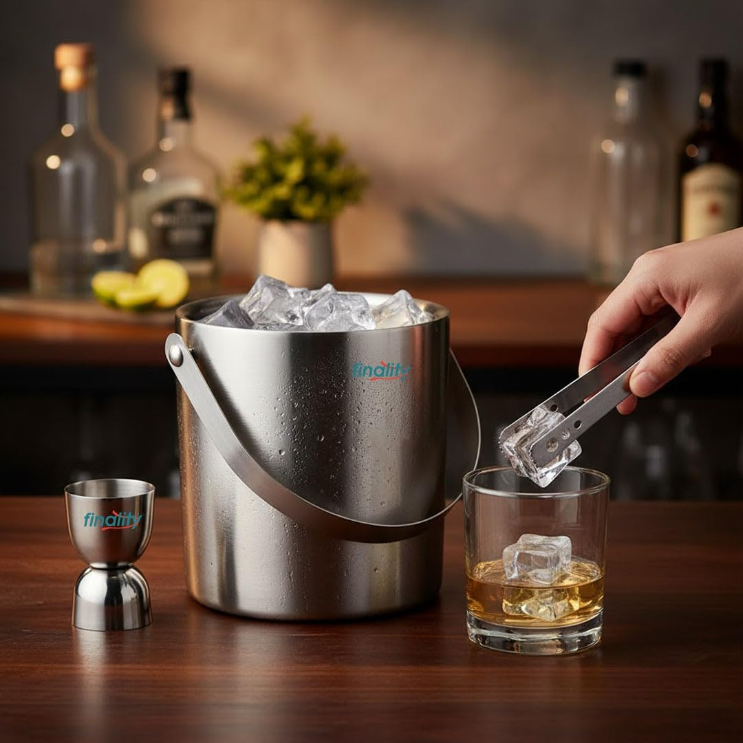 finality Double Walled Stainless Steel Insulated Ice Bucket with Lid | Ice Tong and Peg Measure [ 1 Liter ] Keeps Ice Cold for 6 h | Great bar Tools for Home bar Accessories, Mini bar, Wine
