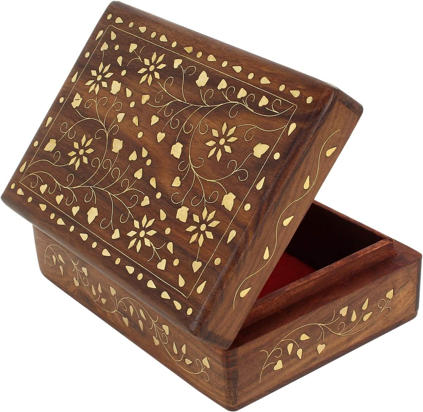 GURU JEE Wooden Hand Carved Decorative Vintage Trinket Jewellery Box Brass Inlay Floral Design