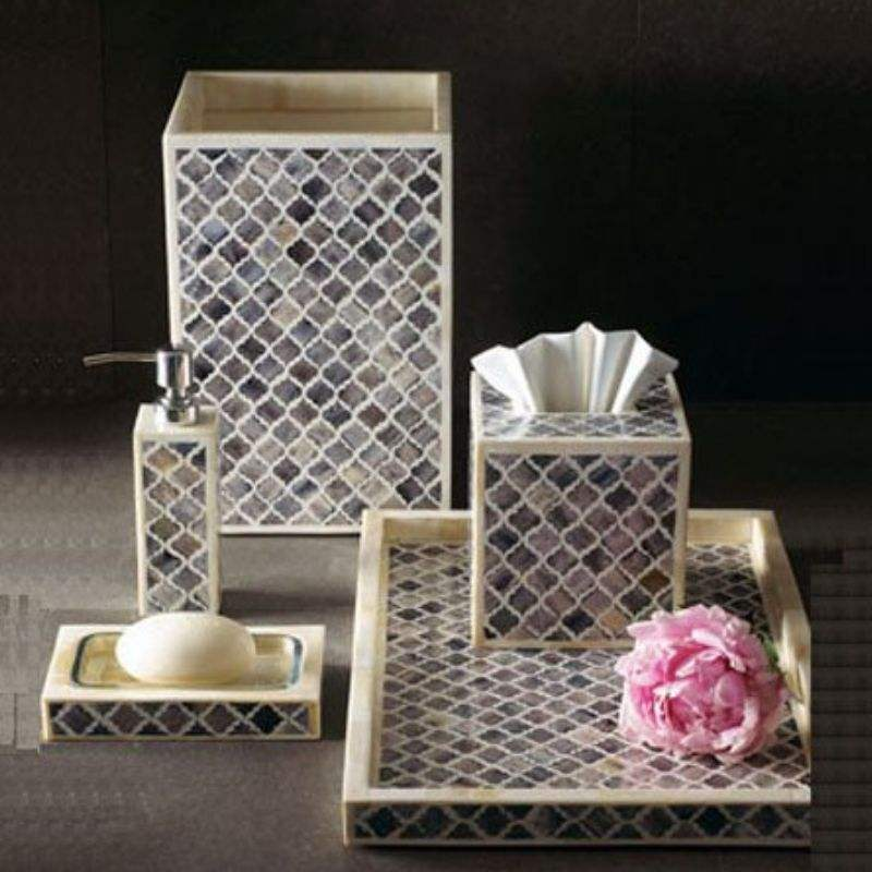 Elevate your bathroom décor with this exquisite Bone Inlay Bathroom Set, handcrafted by skilled artisans using traditional inlay techniques. Each piece is meticulously crafted with ethically sourced bone fragments, delicately set in intricate patterns, and finished with smooth resin for a luxurious look. The set brings timeless elegance and artistry to your bathroom, blending functionality with refined craftsmanship. Perfect for enhancing vanities, guest bathrooms, or as a thoughtful gift for lovers of handmade decor.