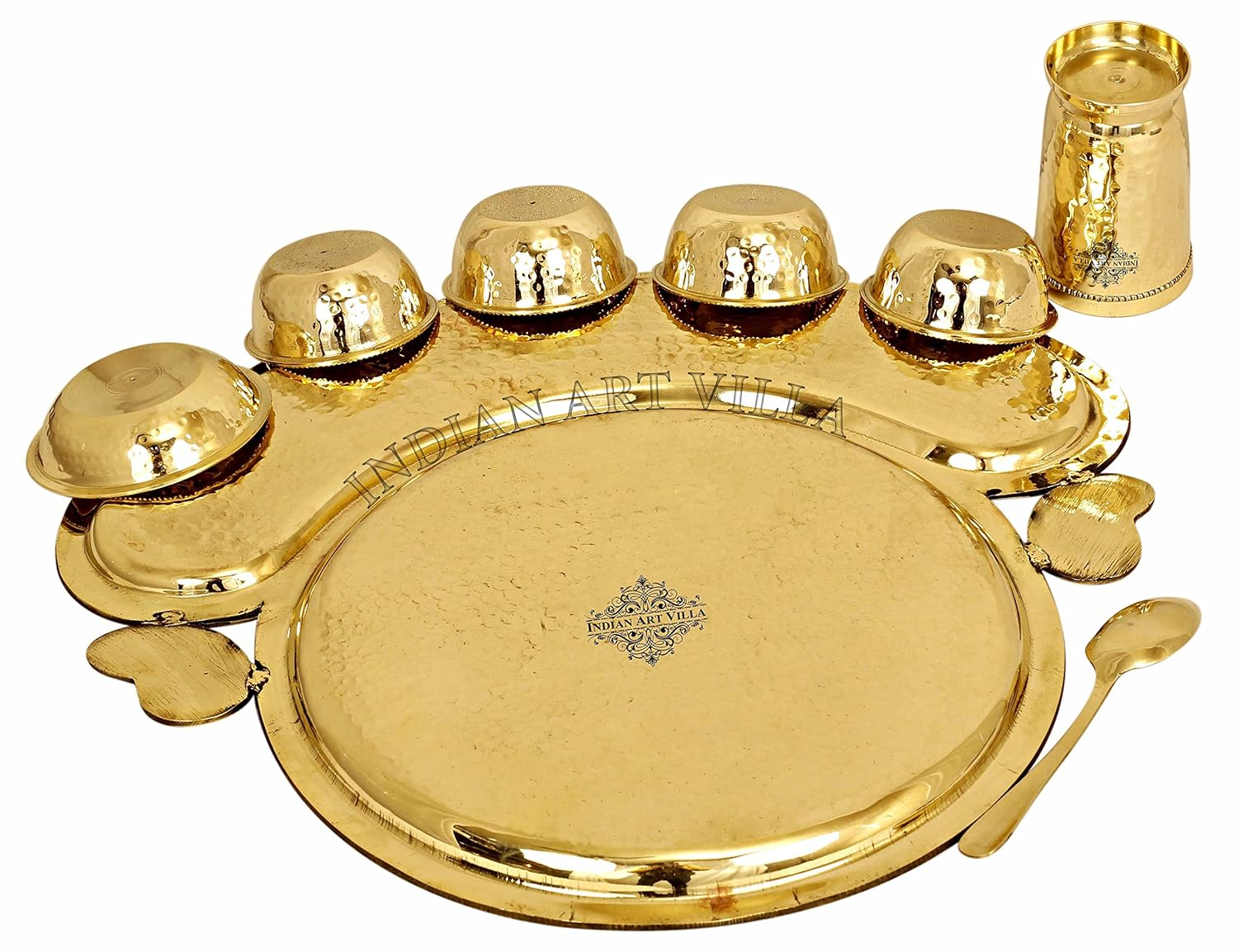 • 🍽️ Indian Art Villa Pure Brass 8 Pieces Maharaja Dinner Set/Thali Set of 1 Big Plate, 1 Glass, 1 Spoon, 1 Small Plate & 4 BowlsColor- Gold