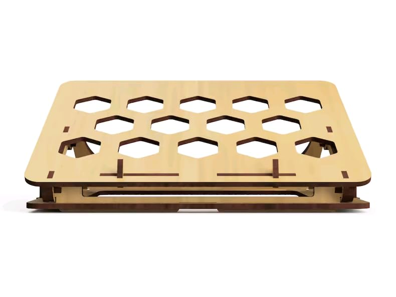 Elevate your laptop experience with this versatile wooden laptop stand. Crafted from reliable wood, it features a honeycomb ventilation design that promotes optimal airflow, keeping your device cool during extended use. With adjustable tilt height, you can find the individual ergonomic angle for comfortable typing and viewing. Measuring 37x27cm, it offers ample space for laptops of various sizes. The integrated carrying handles make it easy to transport, allowing you to work comfortably from anywhere. Embrace the natural warmth and durability of wood with this stylish and functional laptop stand.