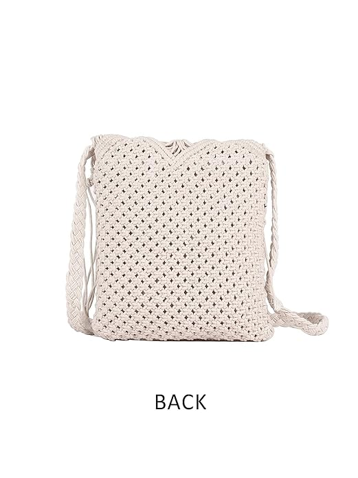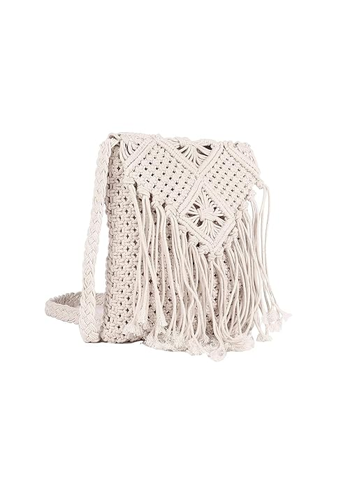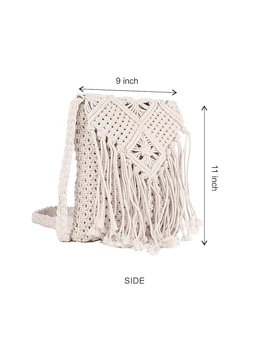 Macrame Bag, Boho Chic Shoulder Tote, Bohemian Crossbody Sling Purse for Girls, Hand woven Hippie handbag Mobile Pouch for Women Fashion, Marriage Party Festival 10×8 Inches, Off-White, 1-Piece