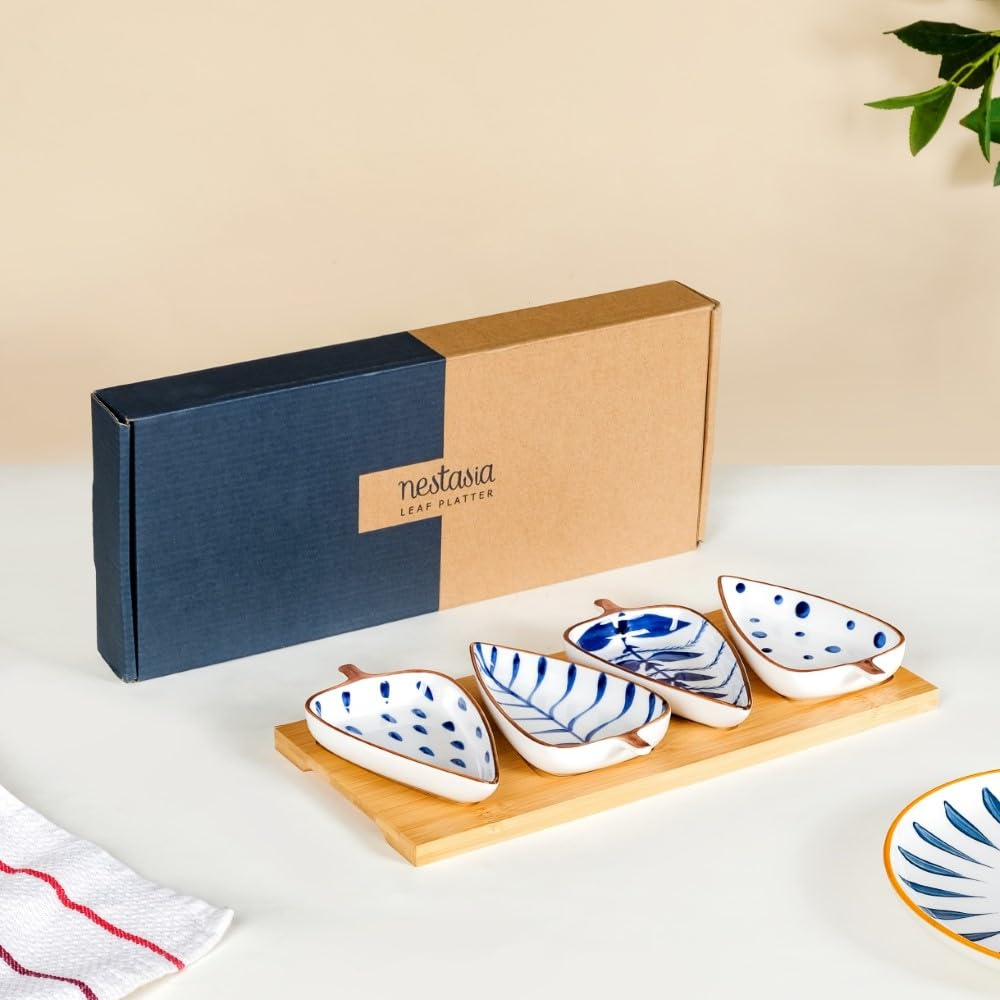 Nestasia Ceramic Serving Platter | 4 Small Leaf-Shaped Plates with 1 Wooden Tray | Perfect for Serving Sweets, Cookies, Dry Fruits, Mouth Freshner & Snacks (Blue & White)