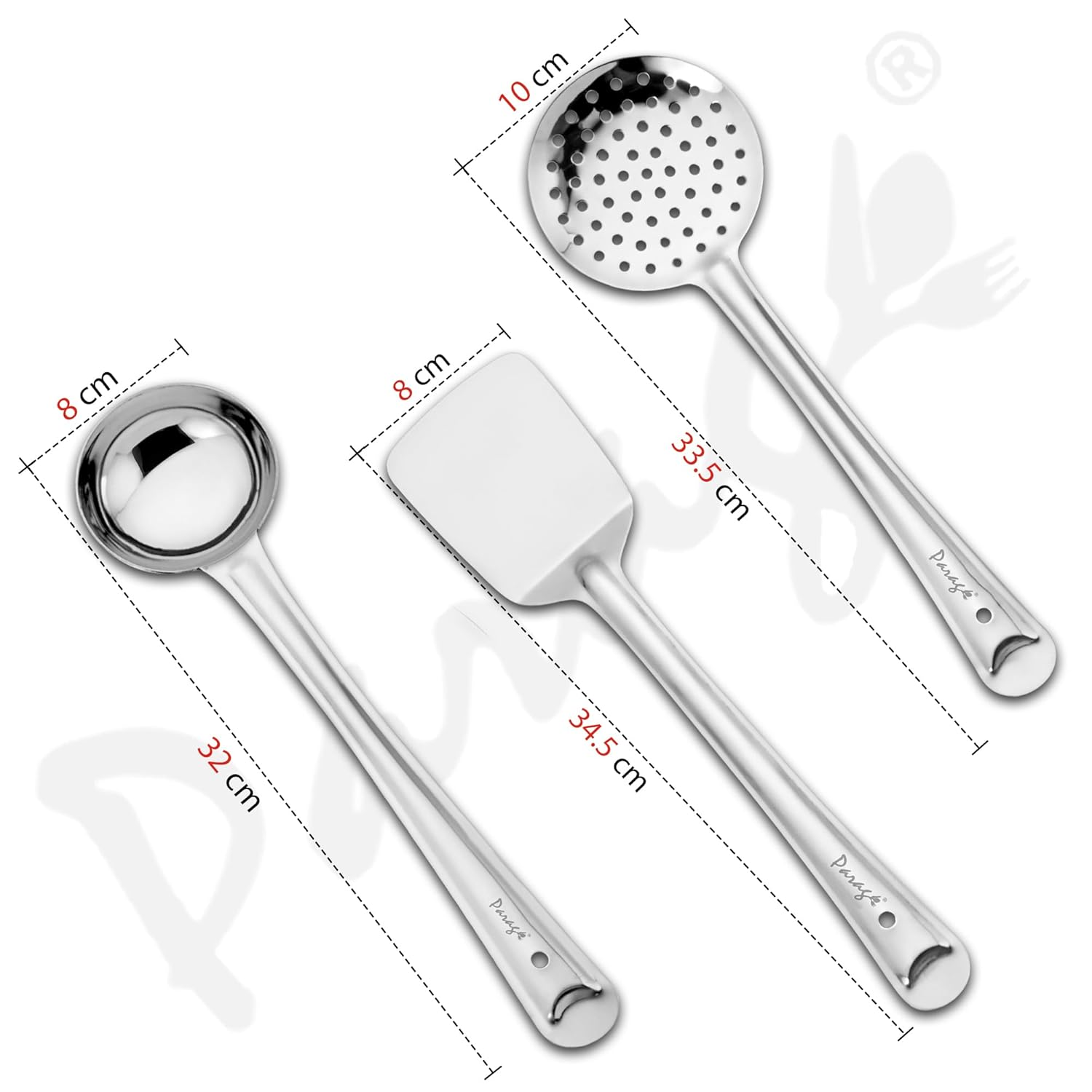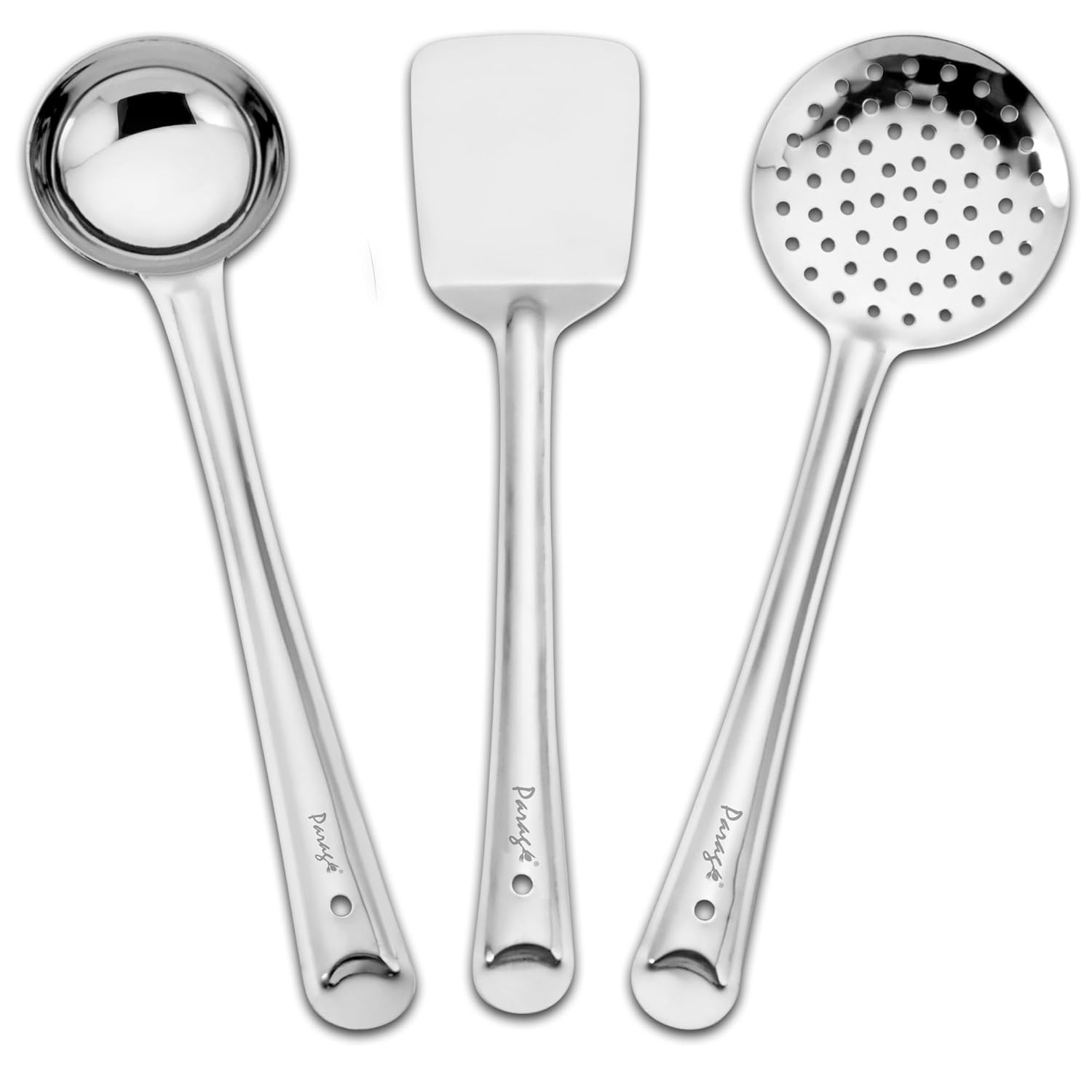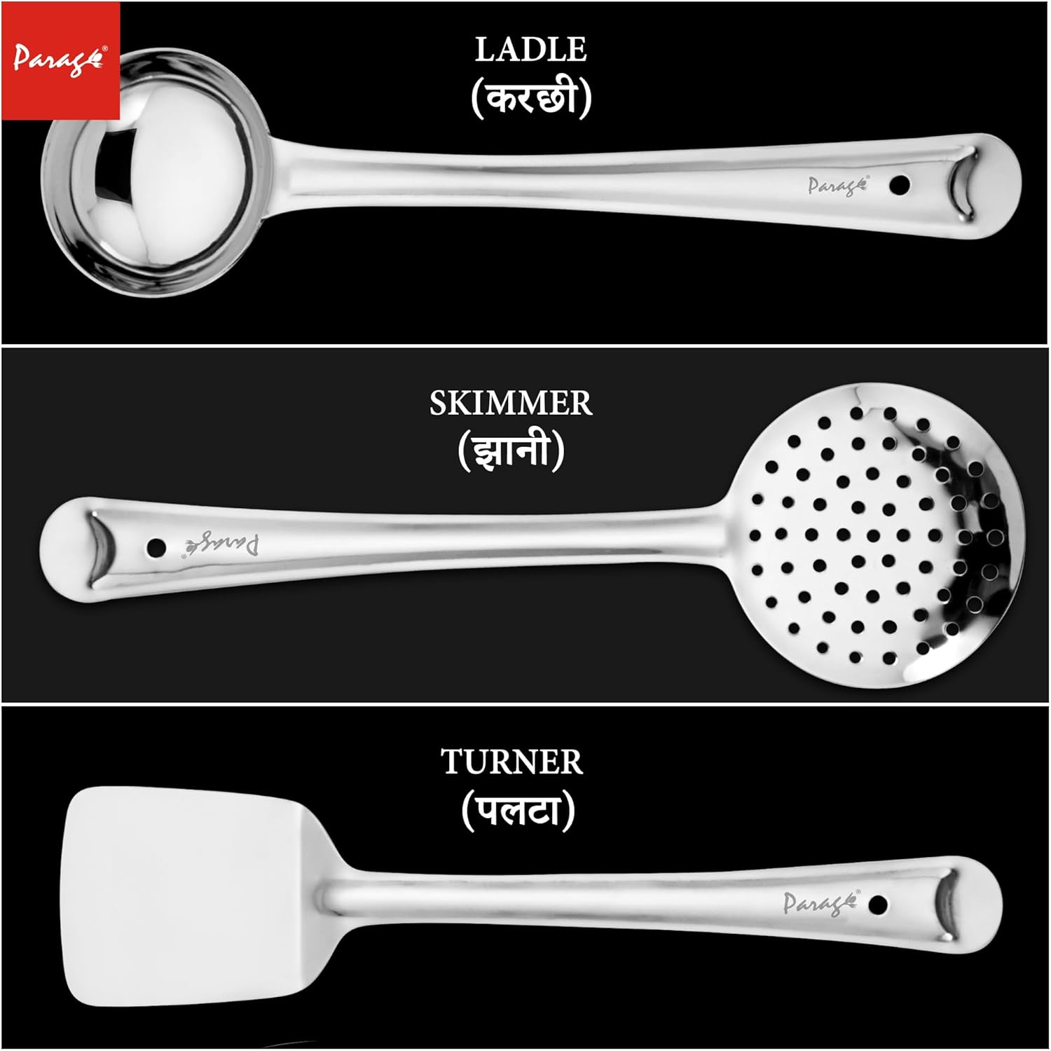 Parage 3 Pieces Stainless Steel Kitchen Tools Set for Cooking and Serving, Pack of 3 Ladle (Karachhi), Skimmer (Jhara) & Turner/Spatula (Palta) Silver