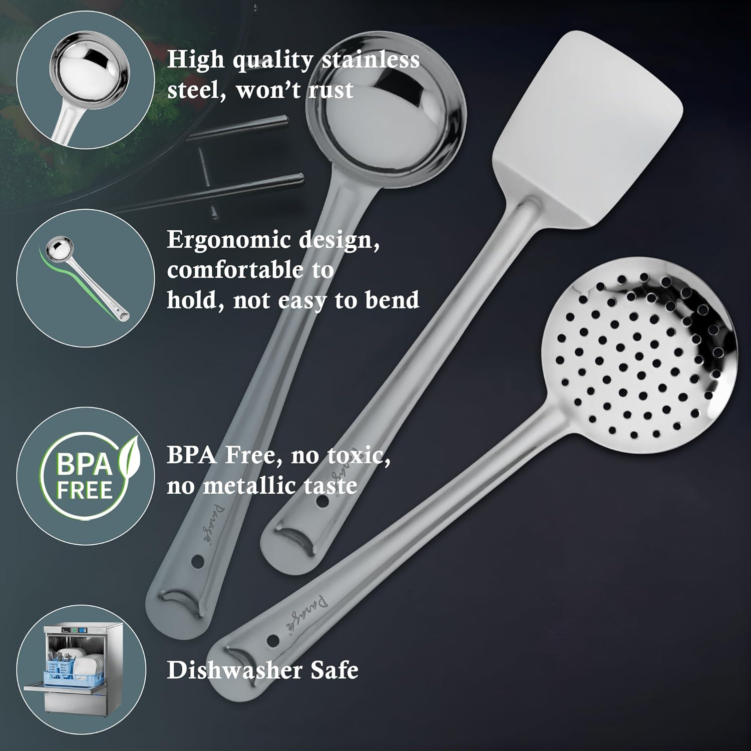 - SMOOTH FINISH-: This Parage cooking spoons set has a smooth finish, and high-quality standards are maintained during manufacturing. Each cooking spoon undergoes inspection and testing for safety and quality, with the goal of lasting for many years of cooking.