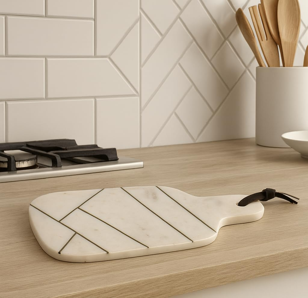 Premium White Marble Chopping Board with Brass Inlay – Elegant Kitchen & Serving Board with Handle