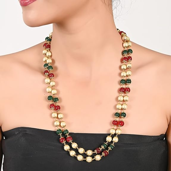 Ratnavali Jewels Double Line Red Green 8mm Golden Pearl Beads Mala Necklace For Women/Girls