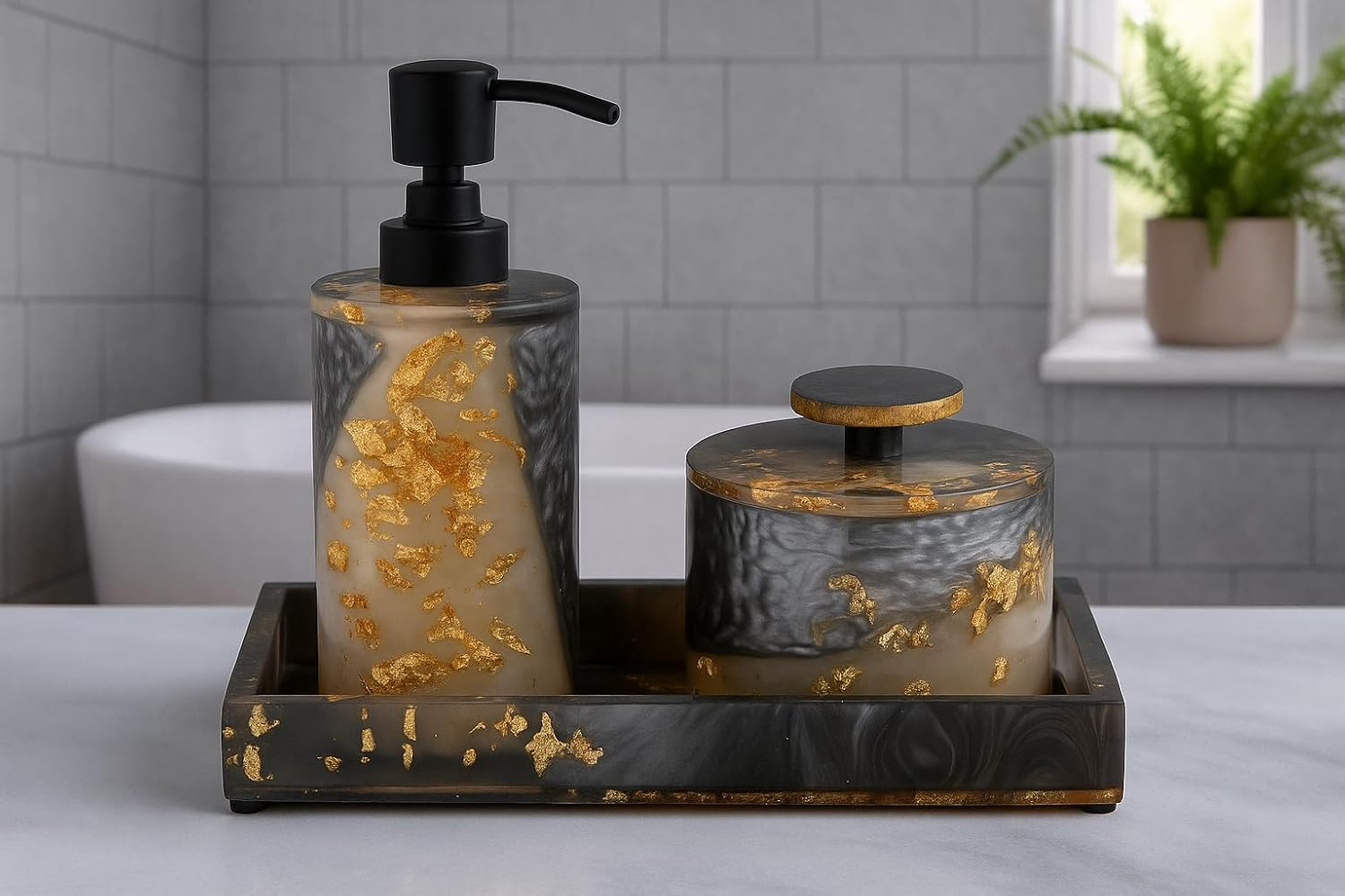 Upgrade your bathroom with this luxurious resin bathroom set, featuring a stunning blend of black, grey, and gold leaf accents. Designed for elegance and functionality, this premium accessory set adds a sophisticated touch to any modern or classic bathroom décor.