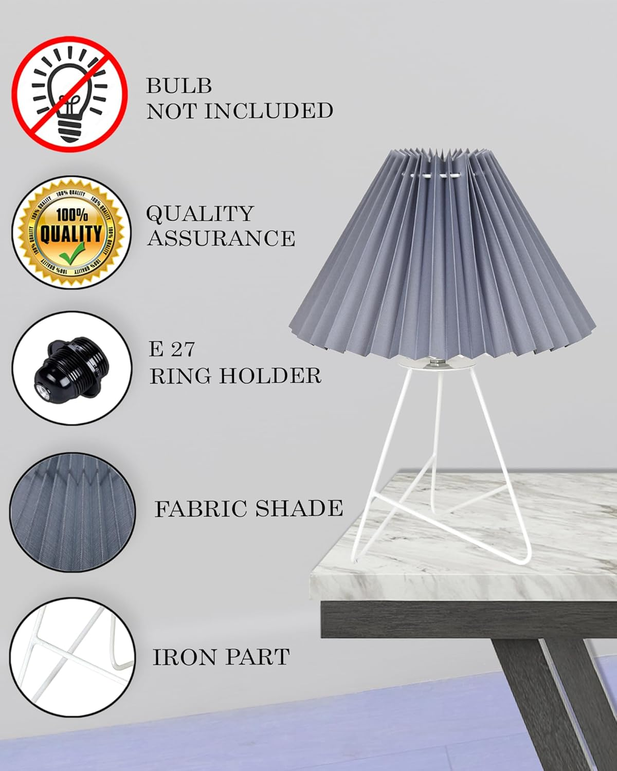 • 𝐄𝐋𝐄𝐆𝐀𝐍𝐓 𝐃𝐄𝐒𝐈𝐆𝐍: This stylish lamp features a sleek, minimalist design with a pleated Grey fabric shade perched atop a tripod metal base.