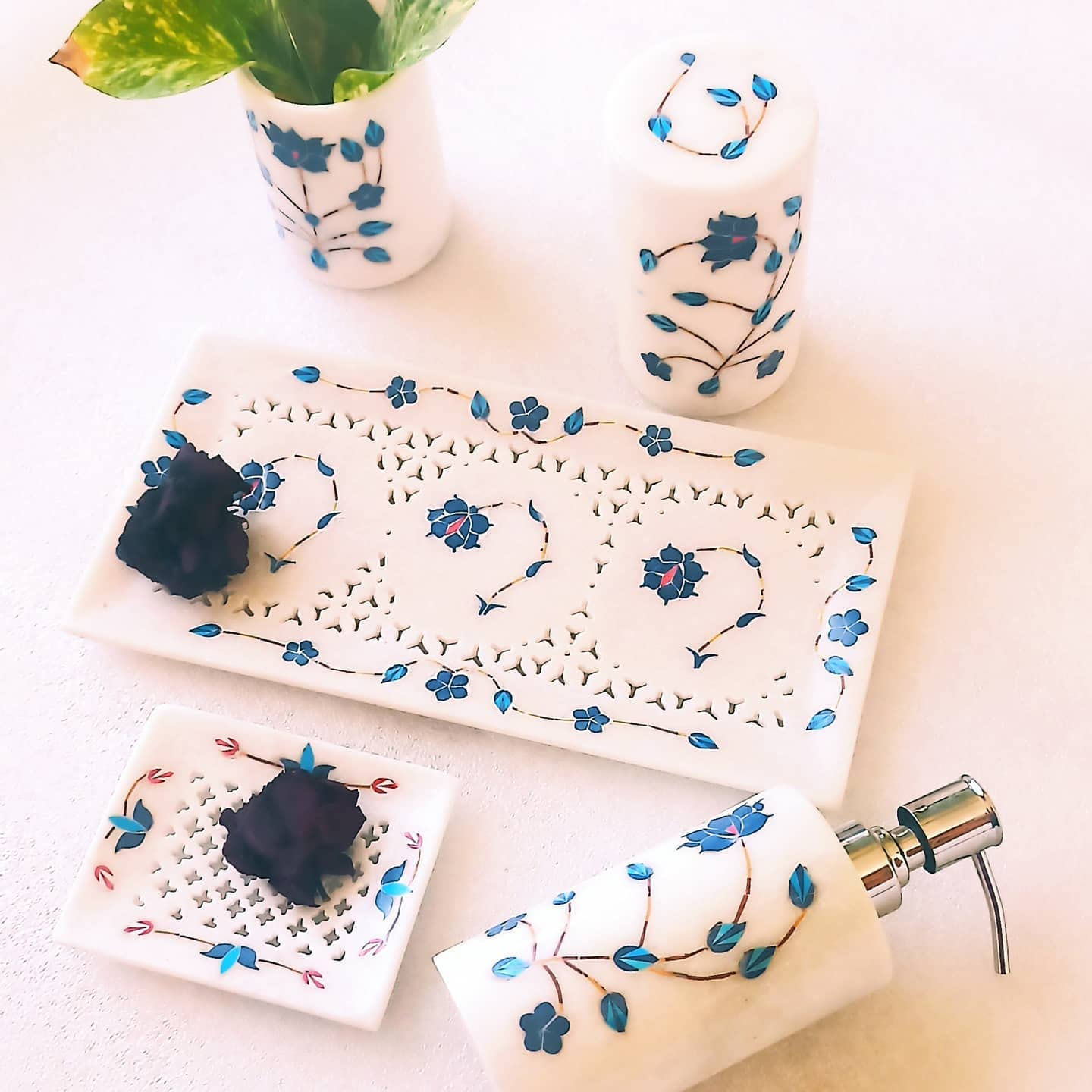 RM 5pieces White Marble Inlay Bathroom Set (Package Include Big Tray, Soap Tray, Cotton Ball Holder, Toothbrush Holder, Dispenser) Marble Bathroom Accessory | Bathroom Set