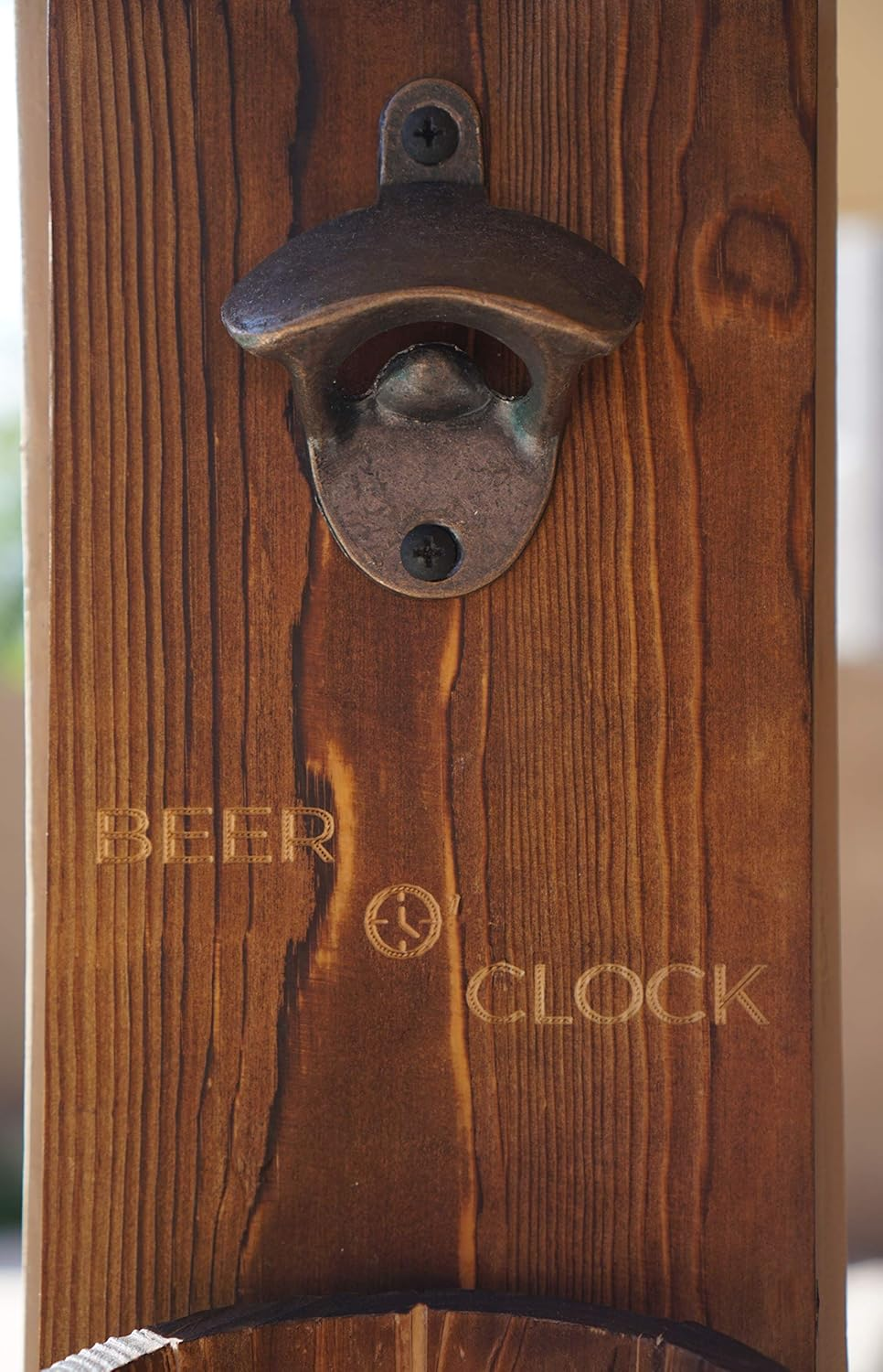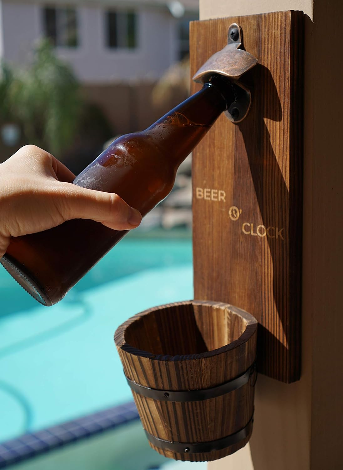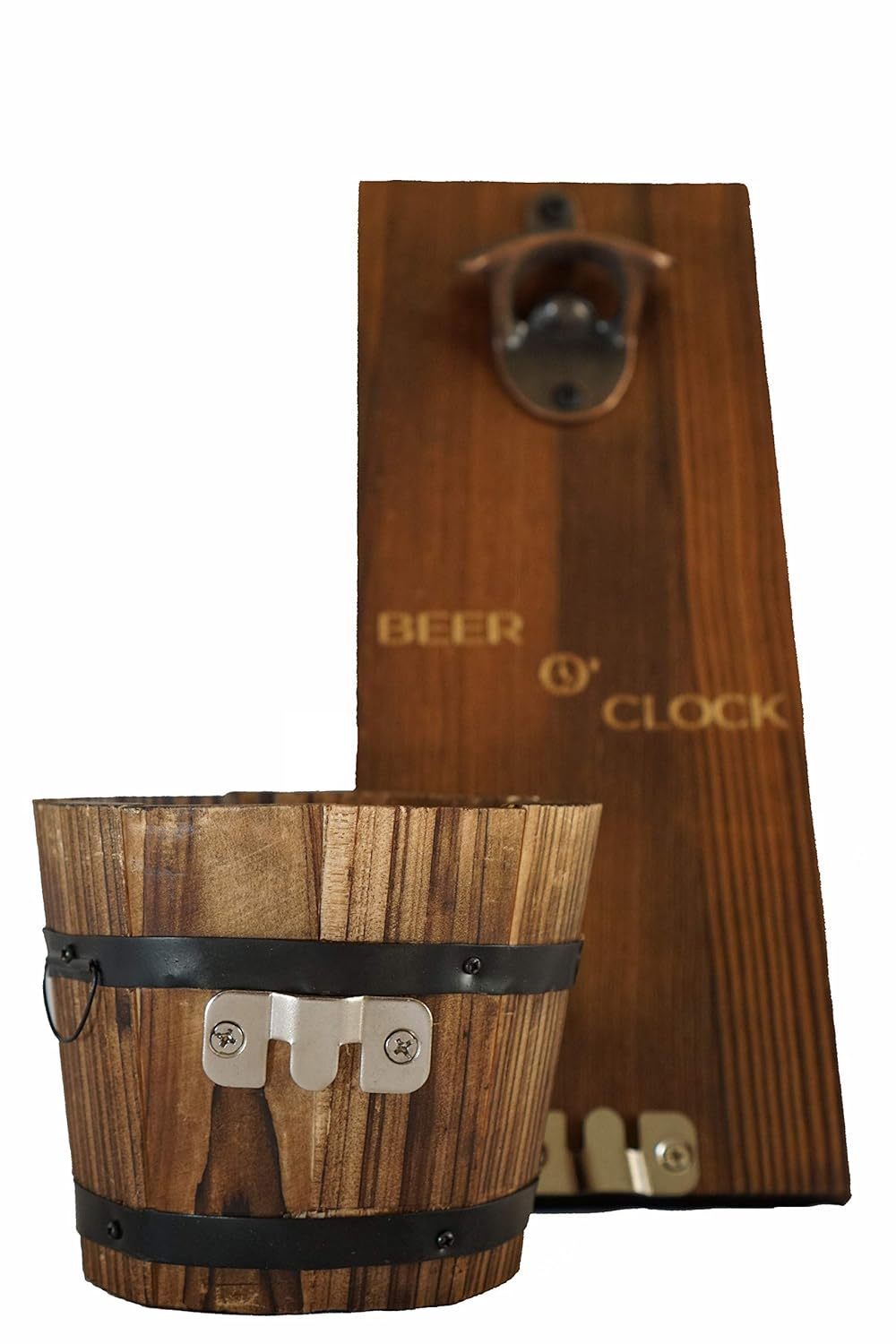 Rustic Wall Mounted Bottle Opener and Catcher – Dark Stain Pine with Zinc Alloy Opener – Removable Wooden Bucket – Man (or Woman) Cave Ready