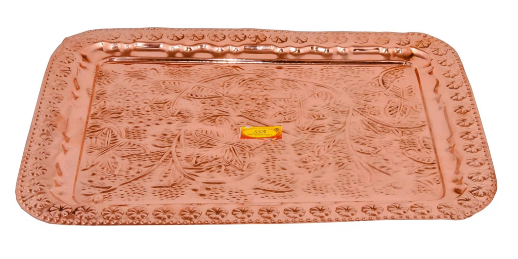 Relish Indian cuisine in Indian style! This is a set of centerpiece serve-ware for Indian food. Serve Indian dishes to your friends and family in this unique and ethnic looking centerpiece serve ware. With this serving utensil set your Indian style dining experience goes several notches up. The material used is food grade. Hammered Copper is used only on the outside of the utensil and does not come in contact with the food. Only the high quality food grade stainless steel is in contact with the food. Two layers of metal with air cushion ensure that the food stays warm much longer. Serving dinner in this dinnerware handi would be unforgettable experience. Care Tips a) Clean your copperware by hand and avoid dishwasher as the detergent can cause oxidation leading to permanent damage. b) Use a solution of equal quantities vinegar or lemon juice and salt diluted with some water at such times but don’t use it regularly. c) Avoid scratchy cleaners like steel wool. d) A simple, soft cleaning liquid on soap base, hot water and a soft washing cloth is best for daily use. e) Use Copper Shining Powder for cleaning the copper utensils. Completely safe and gentle on hands. f) Copper Utensils Tarnish from time to time. This is Normal for an Authentic Copper utensils.