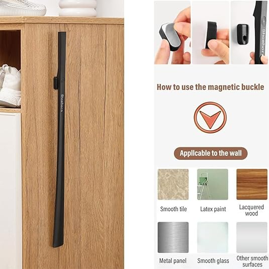- 【ADSORPTION SUSPENSION】Stick it with double -sided tape .Shoe Horn has a strong magnet ,it will automatically adsorb.It can be fixed to the wall,wood and the cabinet ,which doesn’t take up space at all.