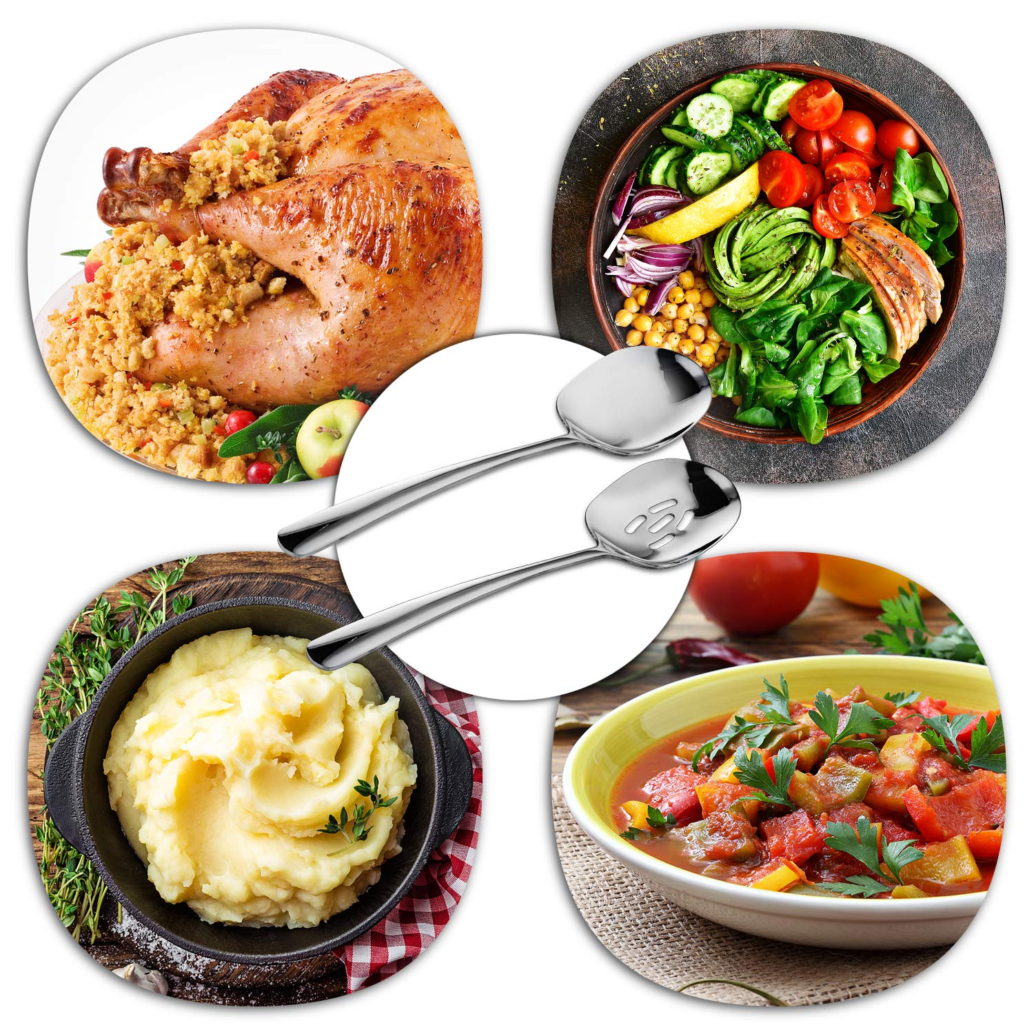 - PERFECT COMBO SET contains one serving spoon and one slotted spoon is great for most serving purposes, as some dishes need to have the juice drained as you serve and others not. Ideal for serving appetizer dishes, main course pasta,stuffing, salad, stews, mashed potatoes and more!