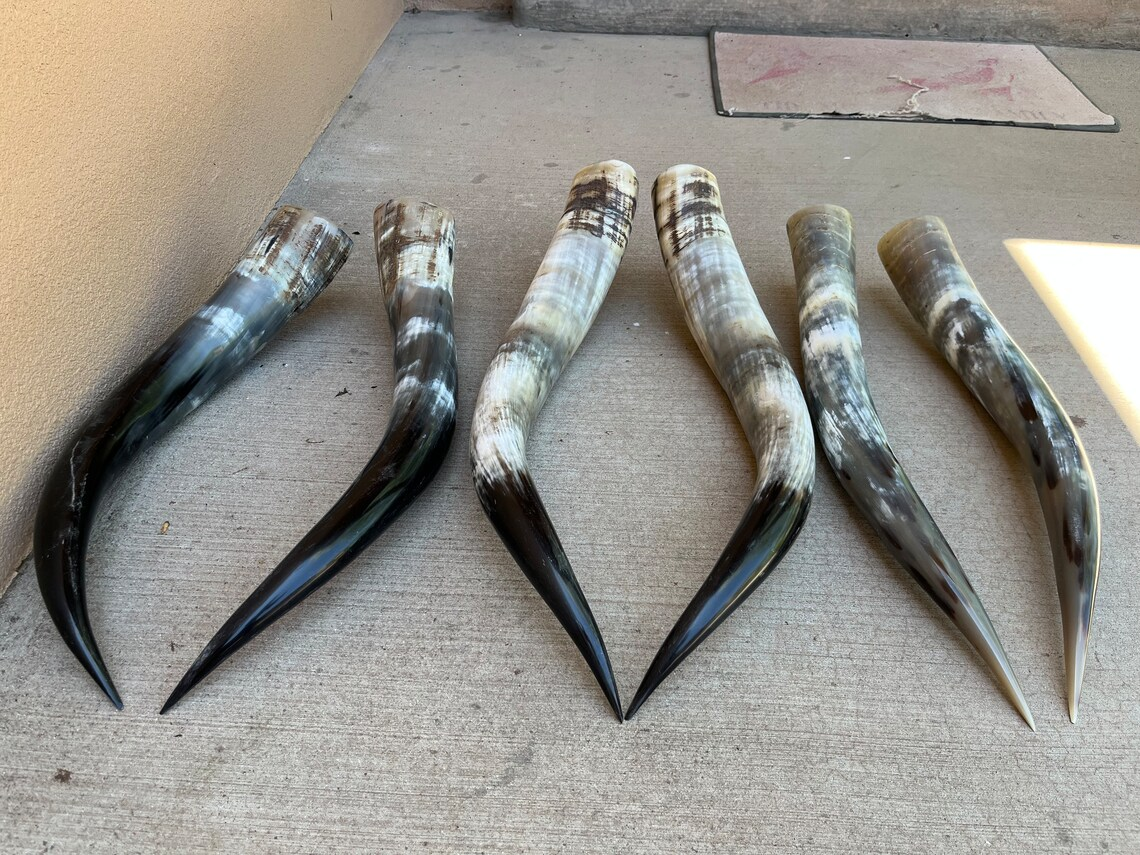 These are Real steer horns that have been fine polished. These horns are 22″ to 25″ inches long tip to base in a straight line and around 24″ to 28″ along the outer curve of each horn. The openings are 2″ to 3″ across in diameter. They are good for black powder horns or mounting or drinking cups or many other arts and crafts uses. This auction is for ONE pair of horns only NOT all the horns in the photo.