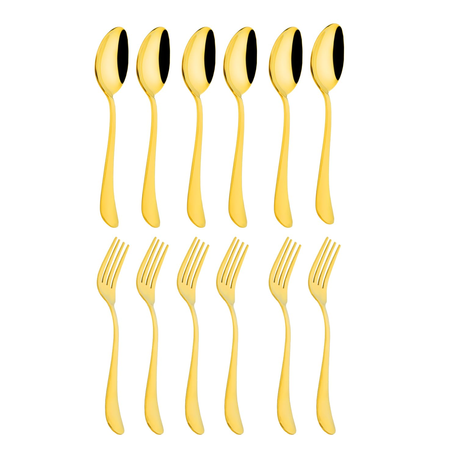 Wooden Serving Bowl with Gold Salad Servers, Large | and | Aster 12 Pieces PVD Gold Dinner Spoon and Fork Set(6 Dinner Spoon+6 Dinner FORK-12 PCS) (Gold)