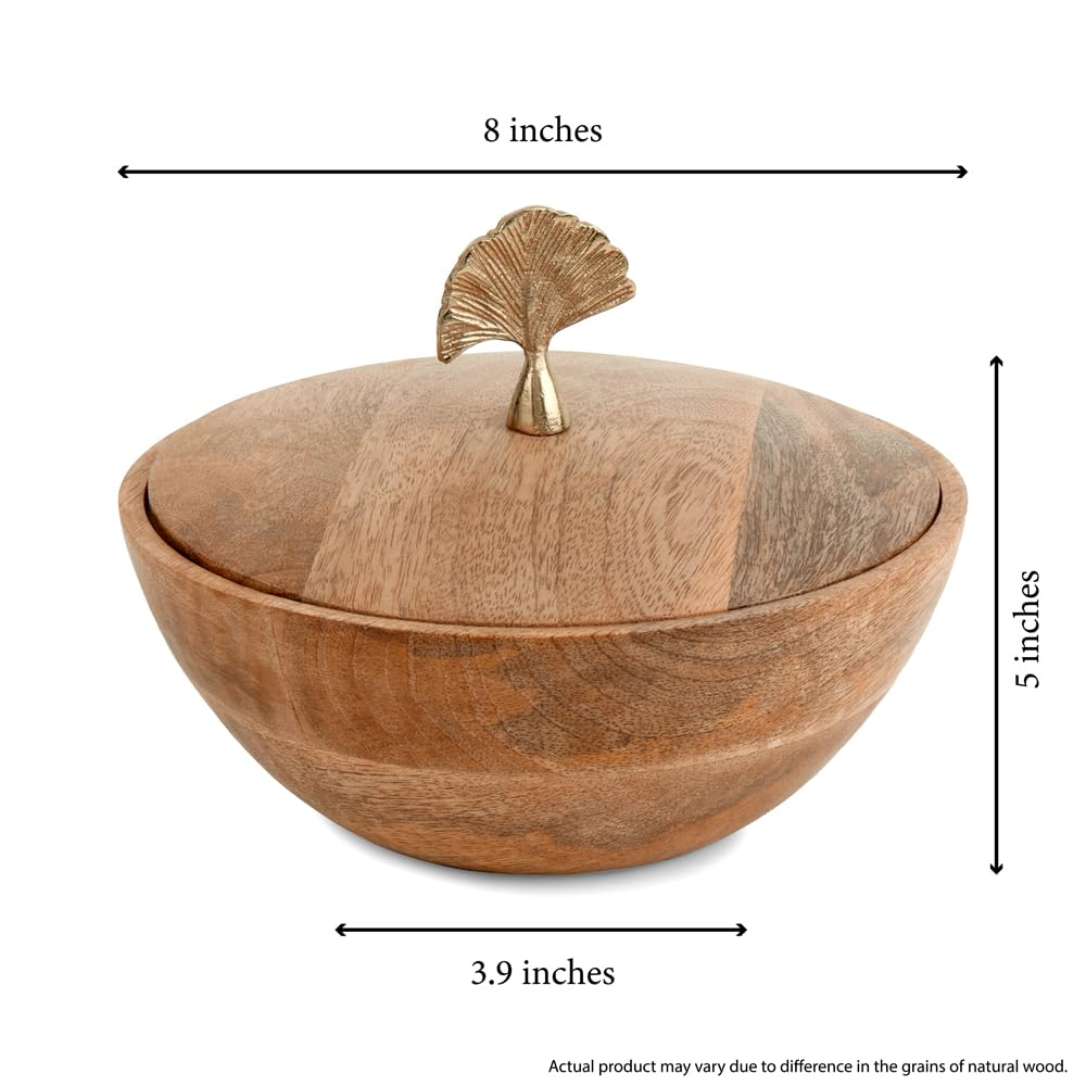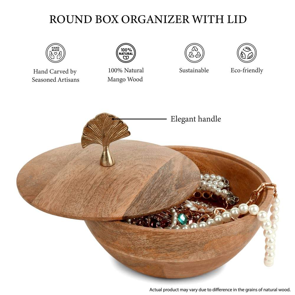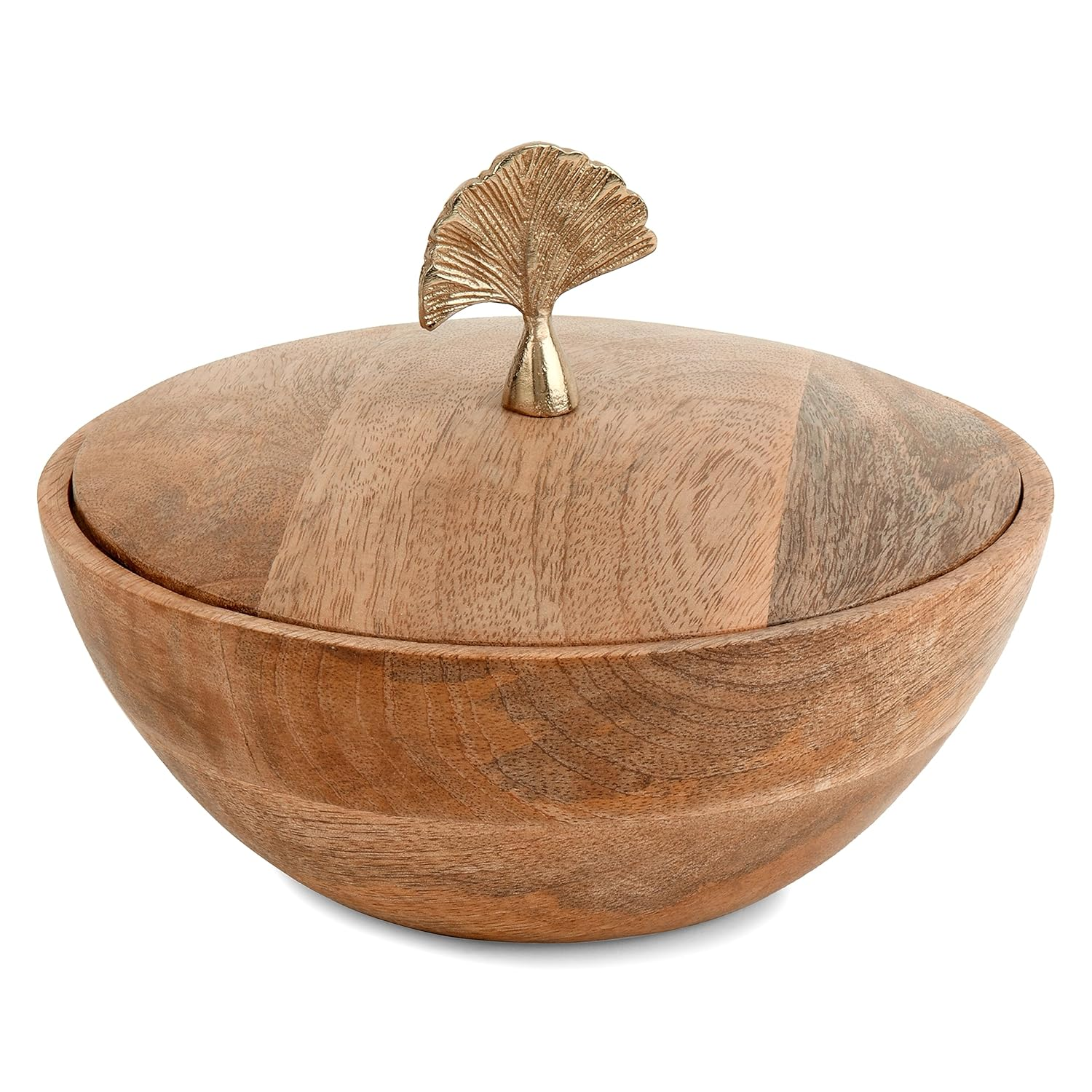 - ✅ Handmade with natural mango wood : This round wood bowl organizer is expertly crafted by skilled artisans and boasts a natural rustic charm. It is visually appealing and has a unique gold polished metal leaf handle. The stable base prevents this from shaking & tilting.