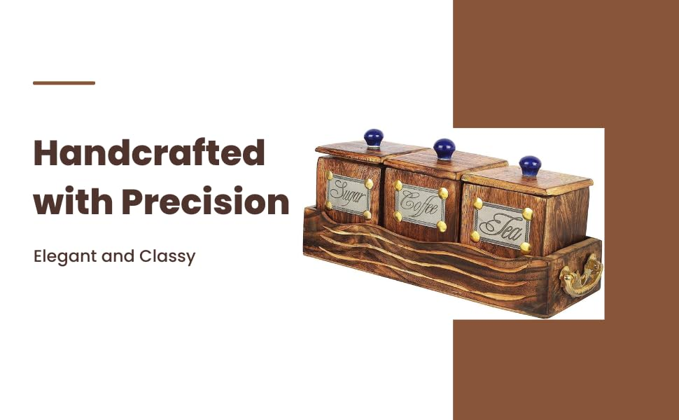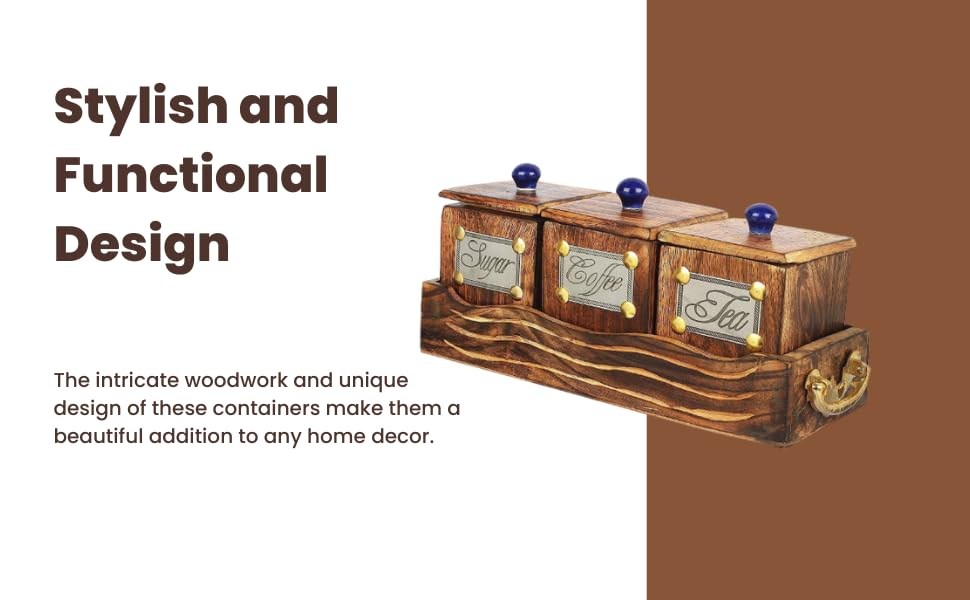 Introducing our Wooden Storage Container Set, a charming addition to any kitchen, crafted with care from exquisite mango wood. This set includes three jars with lids, each designed to preserve the freshness of your coffee, tea, and sugar, keeping your essentials organized and easily accessible. The natural beauty of mango wood shines through in the warm, earthy tones of brown, adding a touch of rustic elegance to your kitchen decor. Each container is meticulously handcrafted, showcasing the unique grain patterns and textures inherent in this durable and sustainable material. The set is completed with a sturdy tray, providing a convenient platform for displaying and serving your favorite beverages. Whether you’re hosting guests or simply enjoying a quiet moment alone, this set adds a touch of sophistication to any occasion. With its timeless design and practical functionality, our Wooden Storage Container Set is the perfect blend of style and utility. Whether you’re a seasoned chef or an aspiring home cook, you’ll appreciate the versatility and charm of this essential kitchen accessory. Upgrade your kitchen storage with our Wooden Storage Container Set today and experience the beauty and functionality of mango wood firsthand. It’s more than just storage—it’s a statement piece that reflects your love for quality craftsmanship and timeless design. User